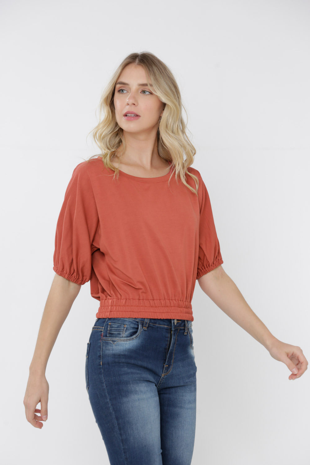 Blusa cropped terracota em tecido moletinho. Possui elástico na barra e nos punhos. Composição: 97% viscose e 03% elastano.