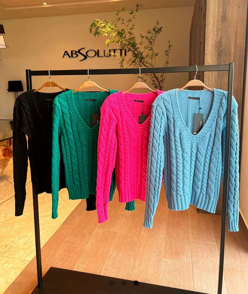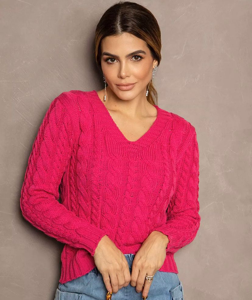 Blusão em V em traças maquiado. Composição: 70% poliéster e 30% acrílico.
